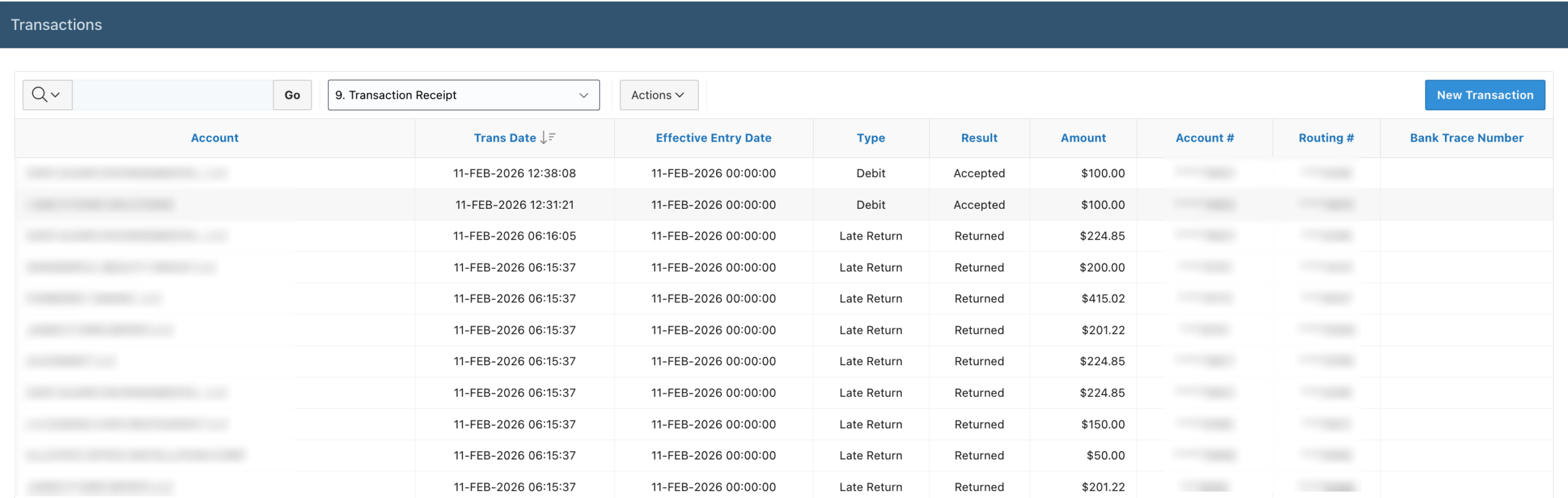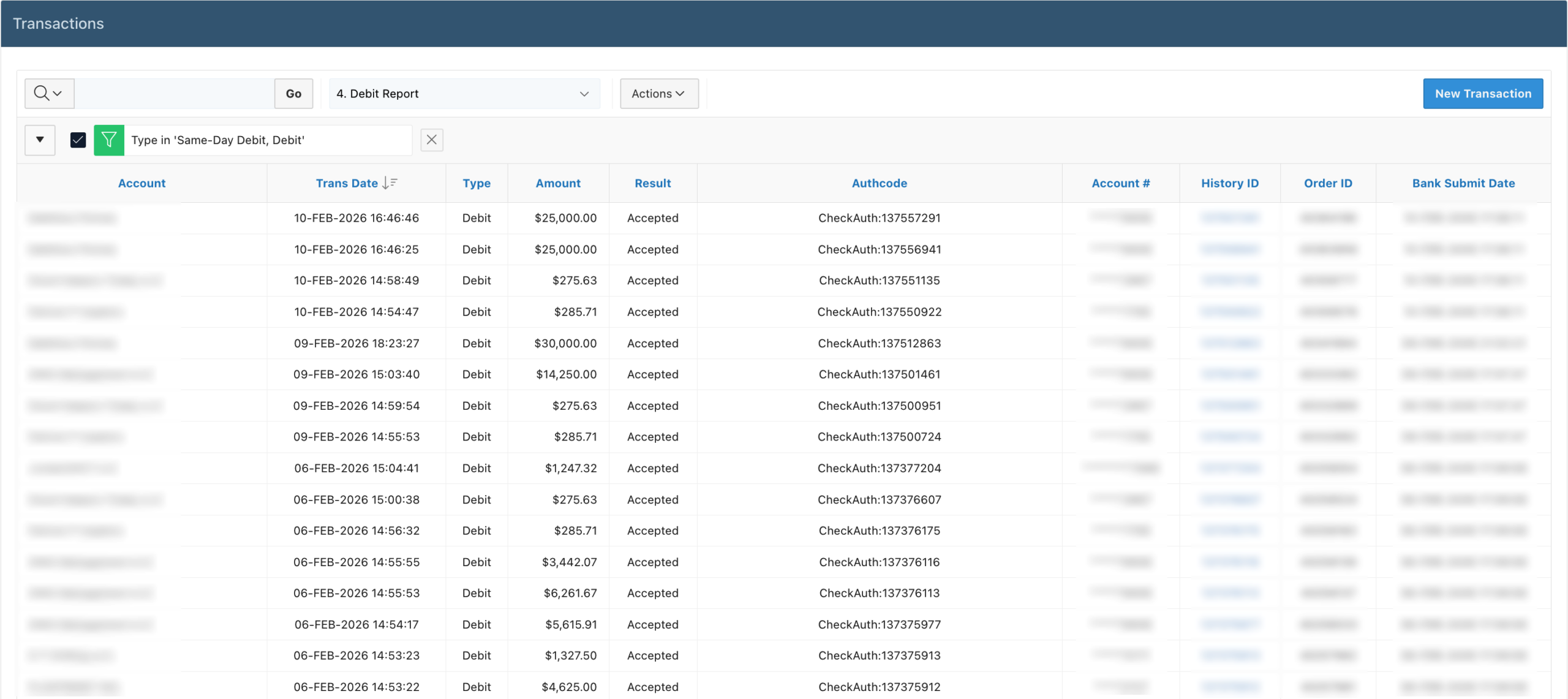 The Primary Report considers all account activities (i.e., Credits, Debits, etc.) with a truncated Bank Account #, History ID, Order ID and Bank Trace Number.